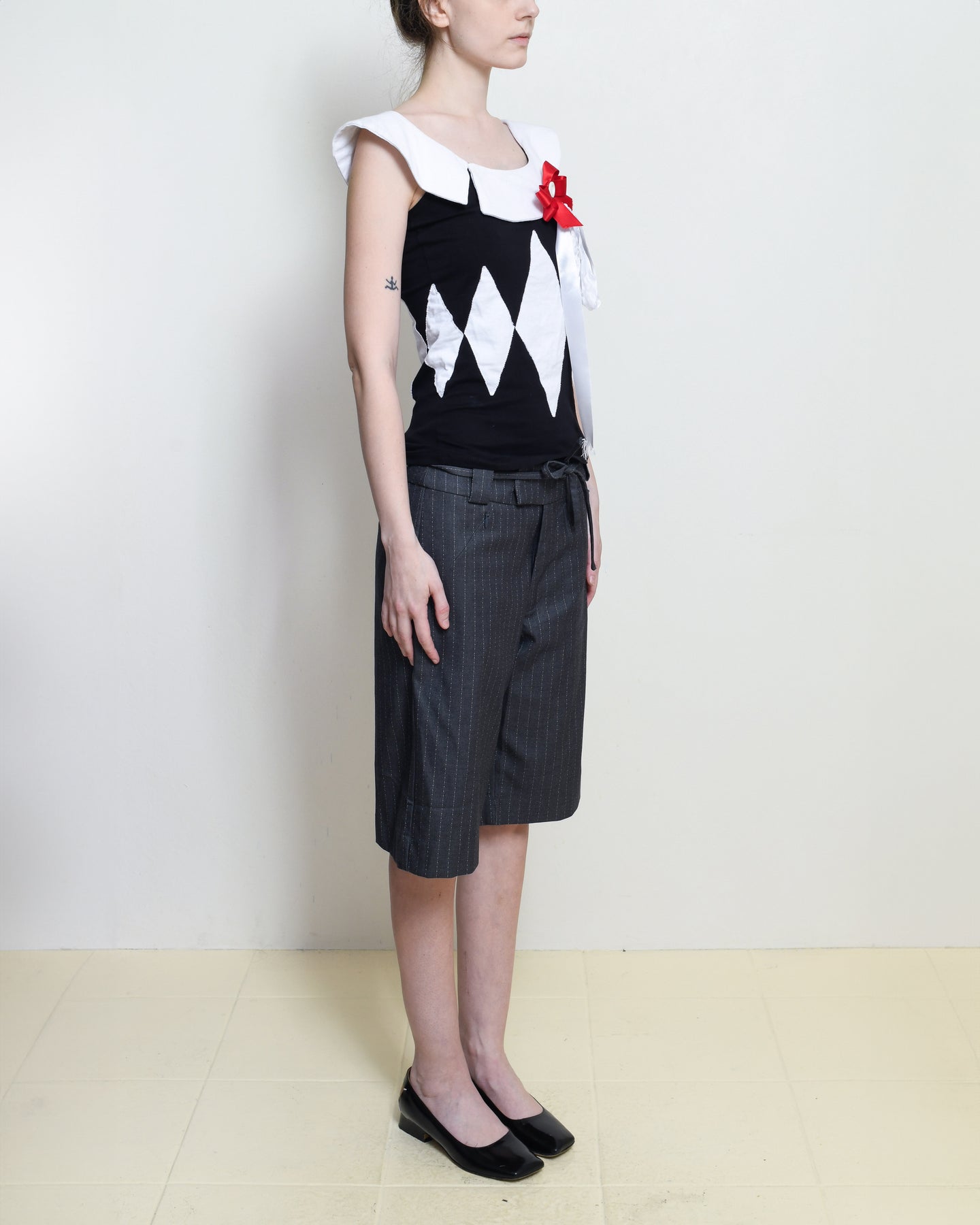 The Una Short is a tailored low rise suit short with a baggy relaxed fit. Designed to be fitted through the waist then loose through the leg beginning just below the hip. Lightly striped suiting, sleek invisible zip pockets on the front and back, removable waist ties Poly/Rayon/Spandex